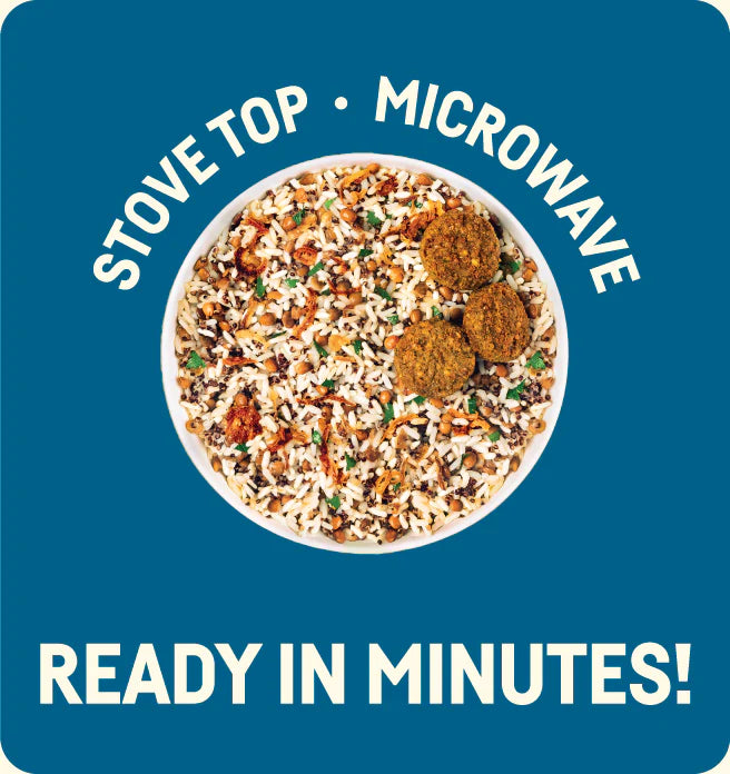 Comfort food cravings got you down? Afia's Crispy Onion & Lentil Mediterranean Falafel Bowl (10 oz) is your taste bud's ticket to the Mediterranean. Imagine a flavor fiesta of fluffy rice, protein-rich red quinoa, and hearty brown lentils, all crowned with 3 traditional falafel. The party doesn't stop there! Crispy caramelized onions and tangy pomegranate dressing brings a burst of freshness. Finished with a sprinkle of parsley, this bowl is a delicious and satisfying journey through the heart of the Mediterranean. Gluten-free, vegetarian, and ready in minutes, Afia's Crispy Onion & Lentil Falafel Bowl is a guilt-free way to fuel your adventures!