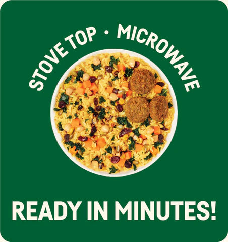 Ditch the prep, not the flavor! Afia's Sweet Potato & Kale Mediterranean Falafel Bowl (10 oz) is your instant passport to deliciousness. This heat-and-eat masterpiece features 3 crispy falafel on a bed of fluffy smoky turmeric rice. Get ready for a flavor explosion with sweet potato cubes, sweetcorn, tart cranberries, and juicy raisins mingling with tender kale, nutty pumpkin seeds, and crunchy chickpeas. A refreshing lemon vinaigrette dressing ties it all together. Gluten-free, vegetarian, and ready in minutes, this bowl is a guilt-free way to savor the vibrant flavors of the Mediterranean. Afia - global goodness, at your fingertips!