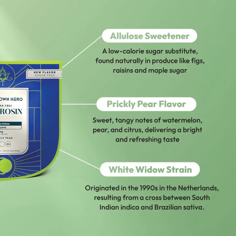Immerse yourself in prickly pear's mellow, tart taste with these artisan-quality, sugar-free gummies. Each piece contains 25mg Delta-9 THC, plus White Widow live rosin for a balanced hybrid experience.
