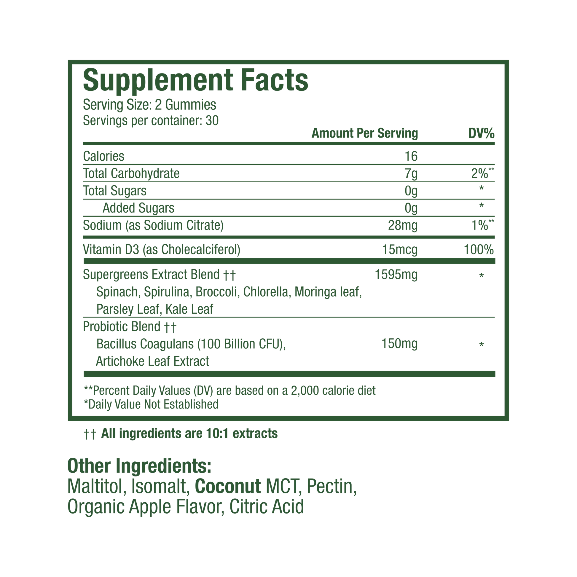 Each serving is a powerhouse with 6 nutrient-dense veggies, Vitamin D3 and probiotics 10 gummies per pouch. 5-day supply.